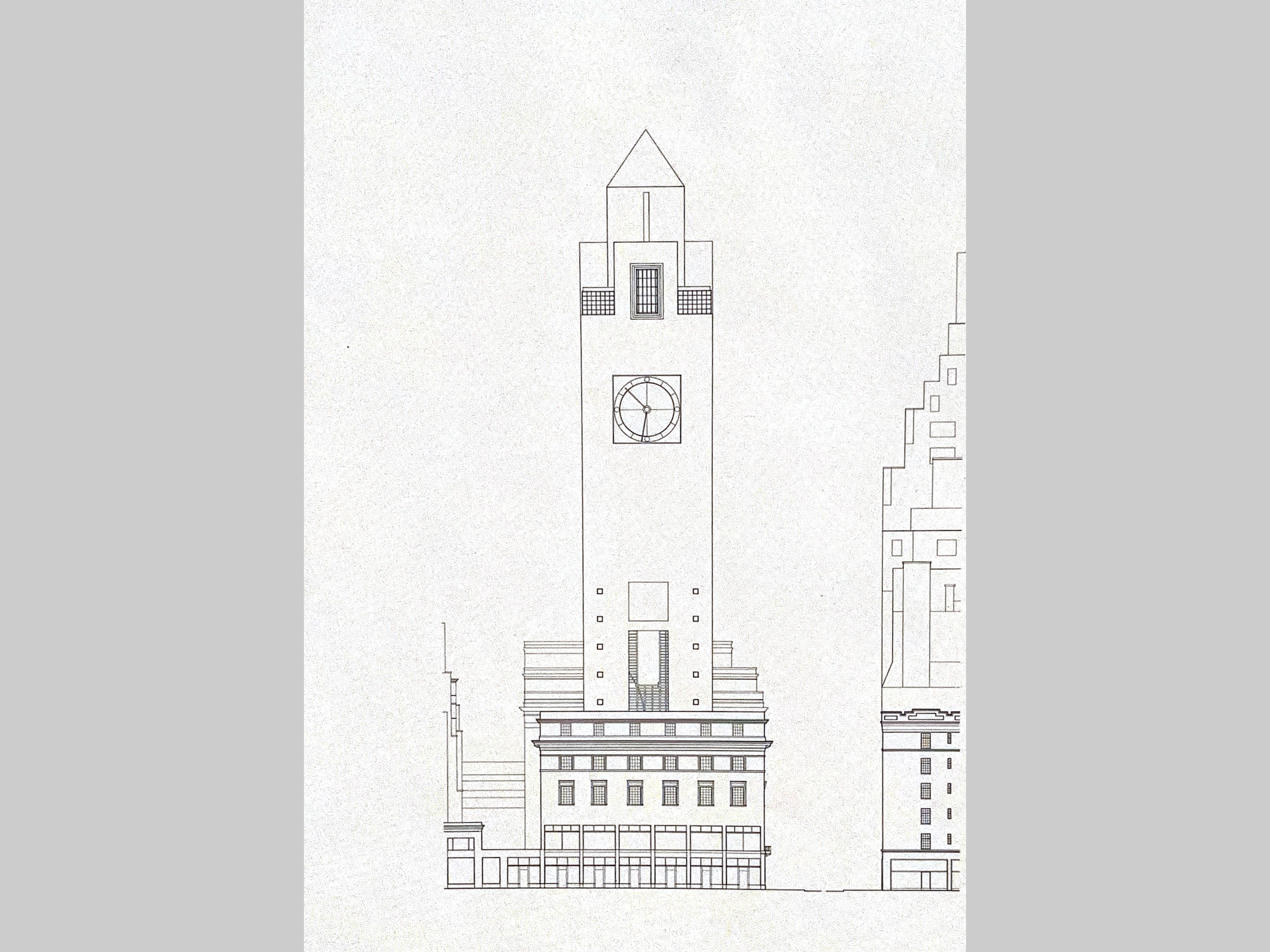 The east elevation facing the avenue is treated as a clock tower, thus making a civic building out of an apartment tower.