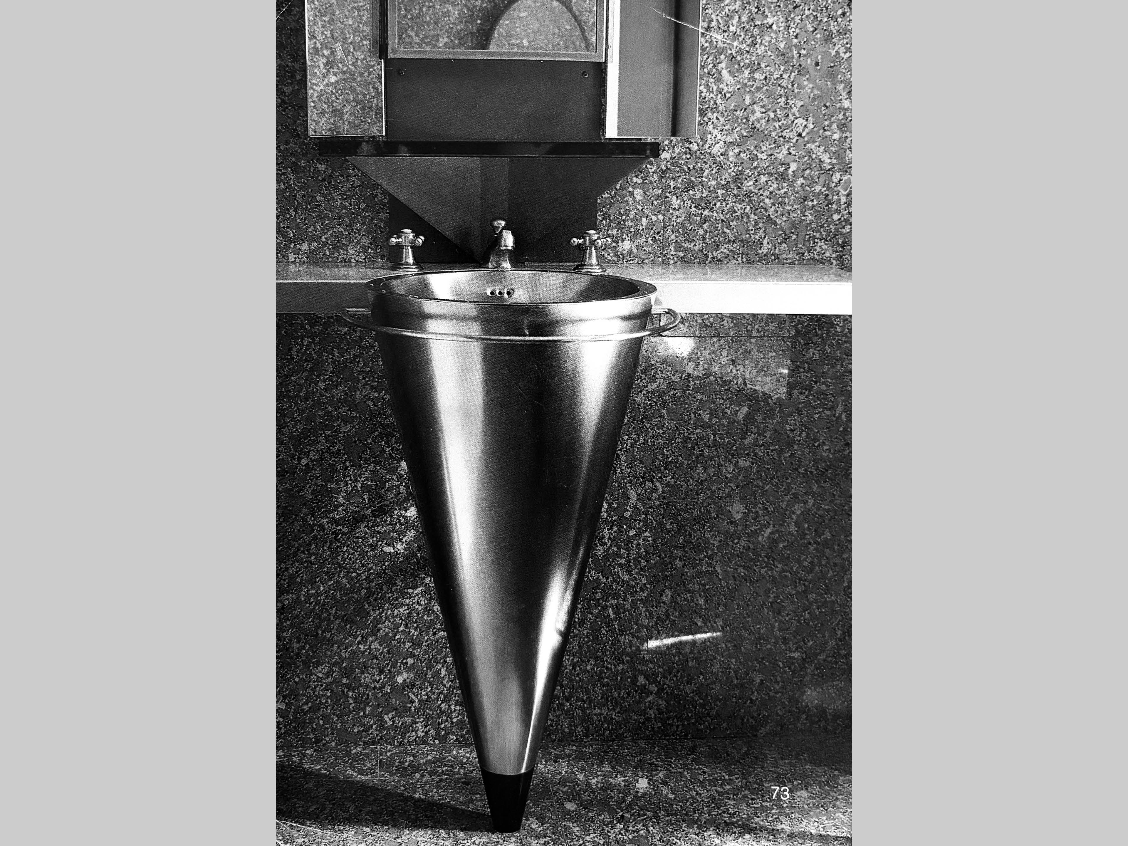 Different elements in steel throughout the apartment mark the significant design moments. The entrance hall itself is a steel “cabin;” one side of it opens into a closet that reveals the structure of the room. A semicircular bar is marked by a steel frame identical to the steel door with a porthole that indicates the transition to the kitchen. A steel slab mantlepiece sits above the living room's fireplace. Finally, a steel cone sink is the prominent object in the bathroom, where a landscape of objects serves as its background.