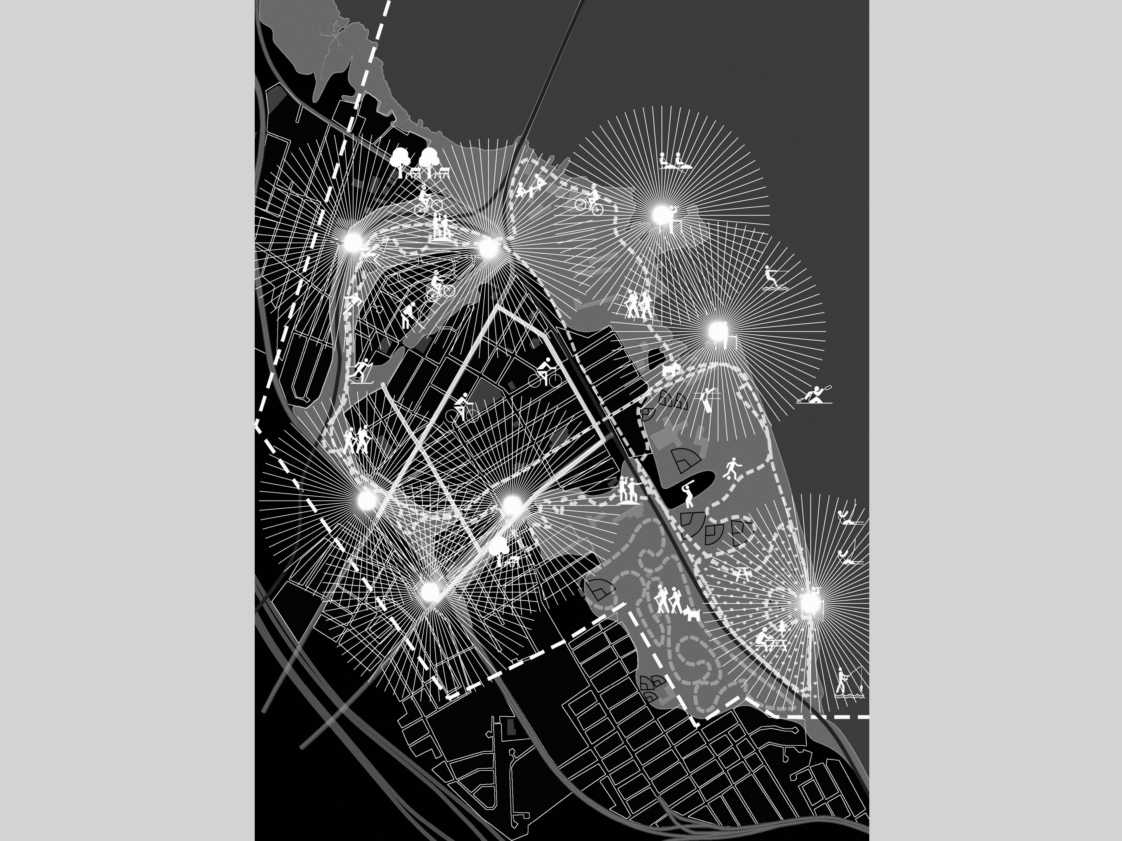 The construction of the railroad in the nineteenth century produced one of the most important changes in the spatial and social organization of the US, the generation of new urbanity. The demise of a number of routes and services in the mid-twentieth century produced a ‘no-man’s’ land that cuts through towns and cities fragmenting them, separating districts and neighborhoods. It also produced a reserve of undeveloped land and an opportunity that the South Amboy Greenbelt (SAG) developed by Agrest and Gandelsonas, Architects, uncovers. The SAG recuperates 340 acres of undeveloped land adjacent to the railroad in the city of South Amboy, one of the stops of the New Jersey Transit Rail. The project proposes to transform the old semi-fast infrastructure of the railroad into a new type of slow infrastructure, a new green zone for walking, jogging, biking, rollerblading, skateboarding and horseback riding articulated by public spaces, sports and cultural facilities powered by clusters of wind turbines.